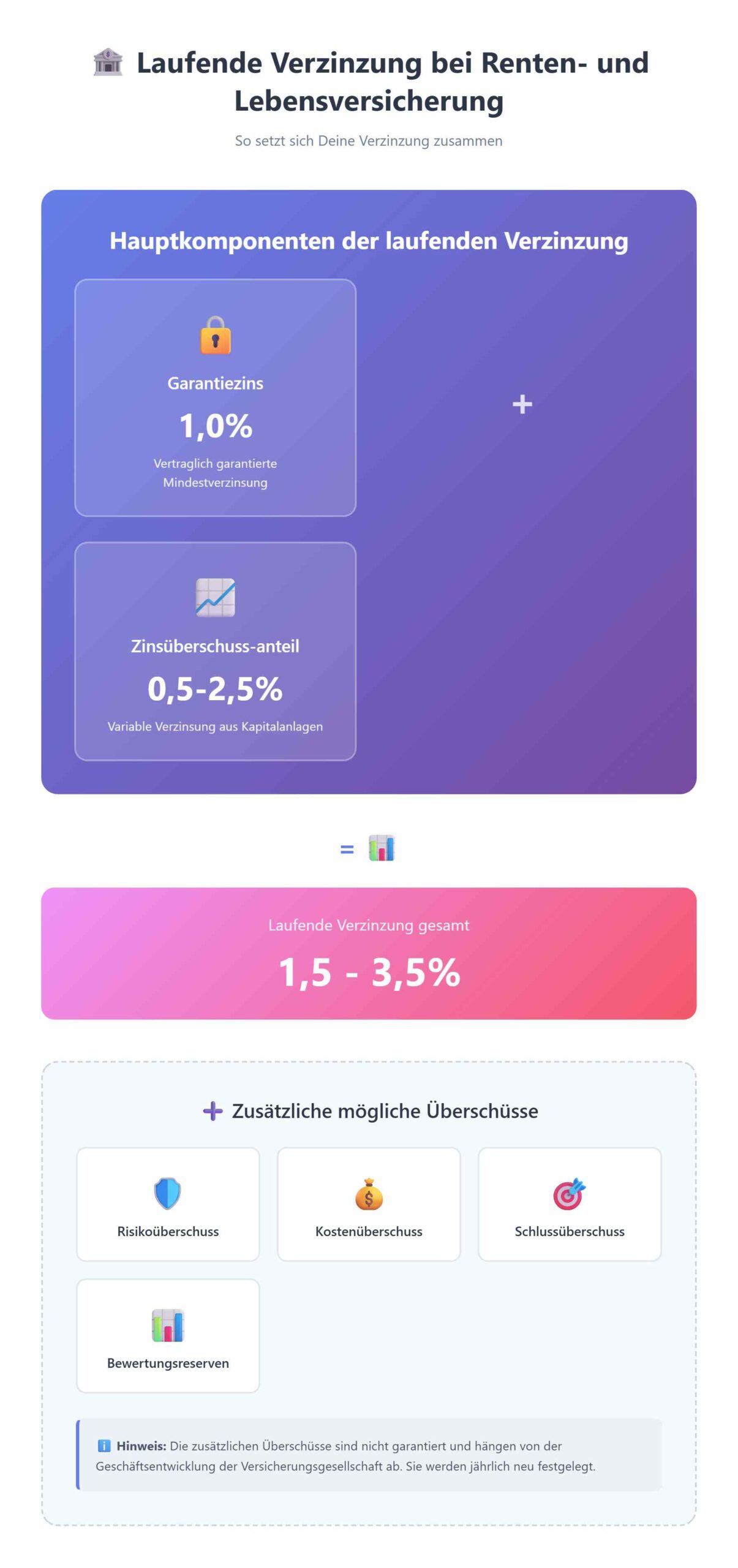 Beispiel einer Versicherungsgesellschaft im Dezember 2025: Die Überschussbeteiligung im Detail: Die laufende Verzinsung für Neuverträge ab 1. Januar 2026 in Höhe von 2,7 Prozent setzt sich zusammen aus 1,0 Prozent Rechnungszins und 1,7 Prozent Zinsdividende. Dazu kommen die Schlussüberschussbeteiligung und die Beteiligung an den Bewertungsreserven, die je nach Tarif zusammen bei bis zu 0,9 Prozent liegen. Die Gesamtverzinsung liegt bei bis zu 3,6 Prozent