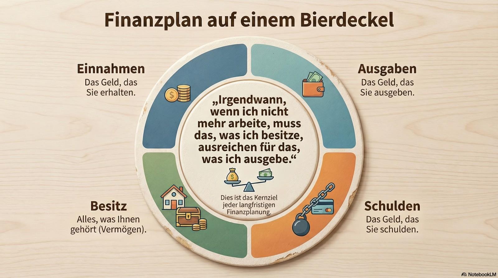 Neulich bei einem Treffen mit Freunden kam die Frage auf: „Wie schaffst Du es eigentlich, den Überblick über Deine Finanzen zu behalten?“ Die Antwort war simpler als gedacht – und passte buchstäblich auf den Bierdeckel vor uns. Ein einfacher Finanzplan muss nicht kompliziert sein. Du brauchst keine Tabellenkalkulation mit 50 Spalten, eine App oder teure Software. Vier Bereiche reichen: Einnahmen, Ausgaben, Besitz und Schulden. Diese vier Quadranten bilden das Fundament, um einen soliden Finanzplan zu erstellen – egal ob Du gerade im ersten Job steckst, eine Familie ernährst oder eine Erbschaft erhalten hast.
