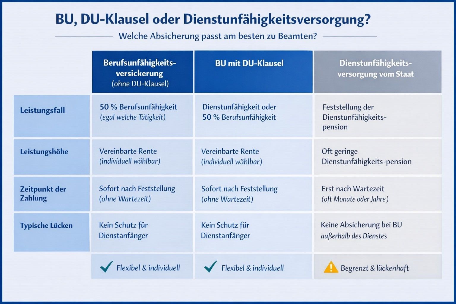Das bedeutet: Es gibt Situationen, in denen keine Dienstunfähigkeit festgestellt wird, obwohl du deinen Beruf faktisch nicht mehr ausüben kannst. Genau hier kann eine BU greifen und zusätzliche Sicherheit bieten.